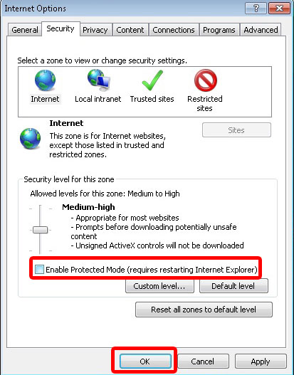 1.Open the IE browser (Internet Explorer), in the upper right corner to choice "Tools" -> "Internet Options, in the “Security” column do not tick "Enable Protected Mode (requires restarting Internet Explorer" then press OK to confirm.