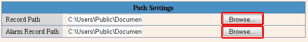 Alarm Record Path : The location of storage by system automatically recording, when the fuction “Motion Detect Armed” is switch on.